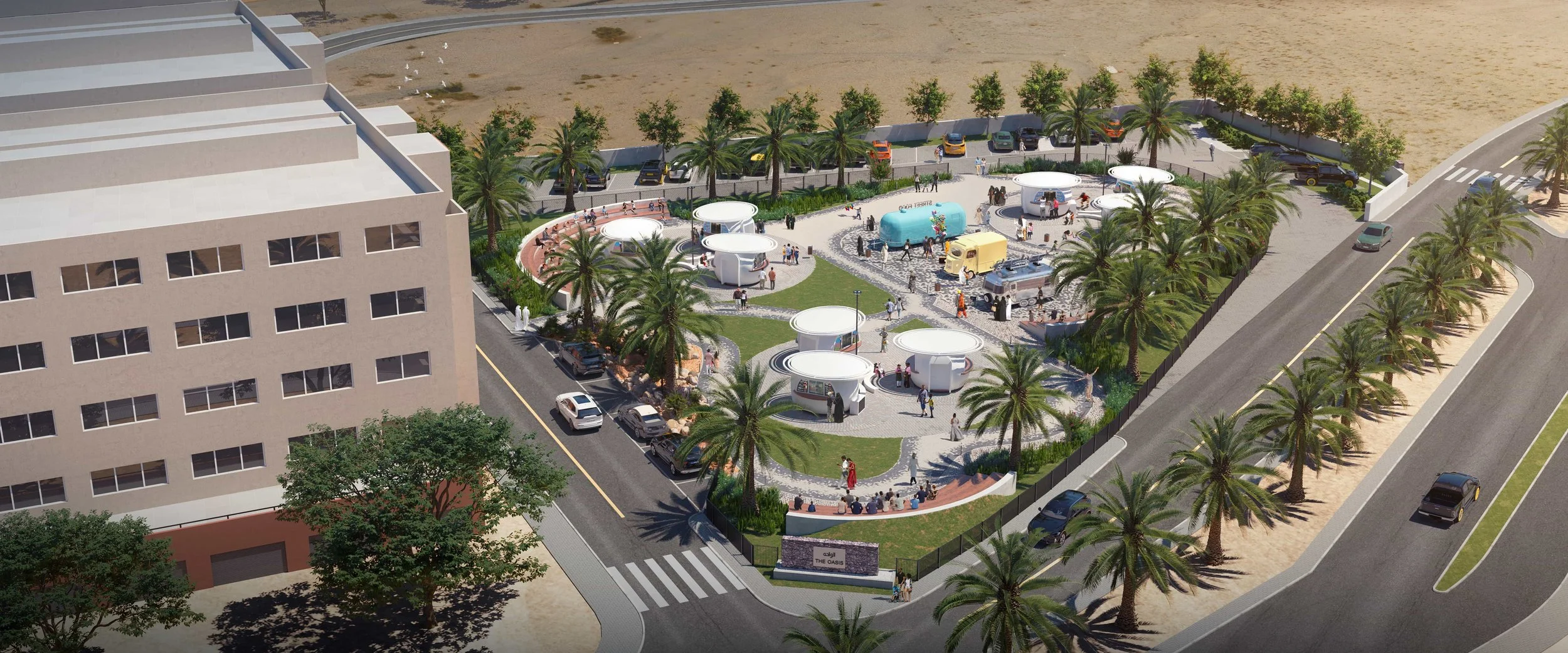 Consisting of nine re-purposed food kiosks and provision for three food trucks, The Oasis was created as an urban sanctuary where the inner areas of the park are surrounded by lush landscape and trees to provide a completely unique and well shaded food park within Al Quoz.